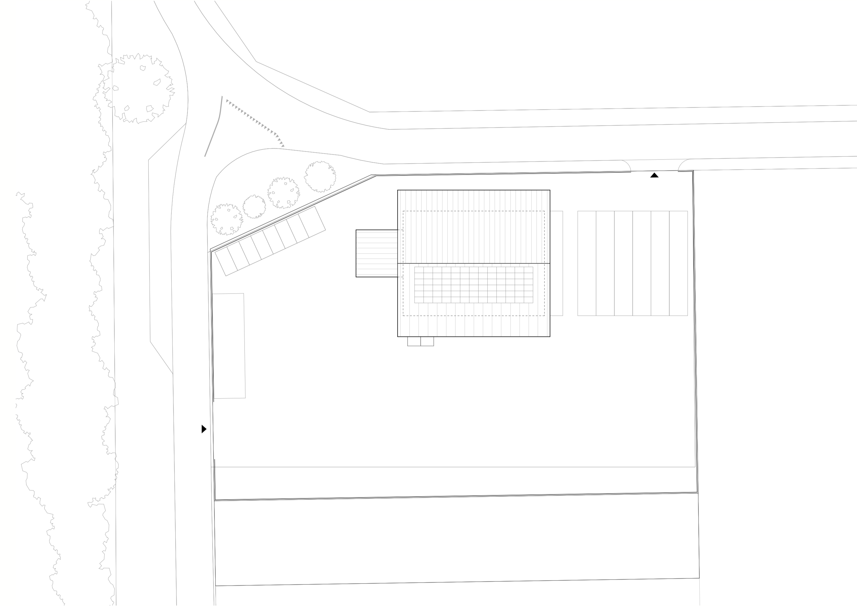 Les besoins de l’entreprise sont surtout de stocker les véhicules autour et/ou dans la halle, c’est pour cette raison que l’espace autour du bâtiment est dénué d’aménagement. Une bande végétale au sud de la parcelle permet de marquer la limite et fait également office de bassin d’infiltration.