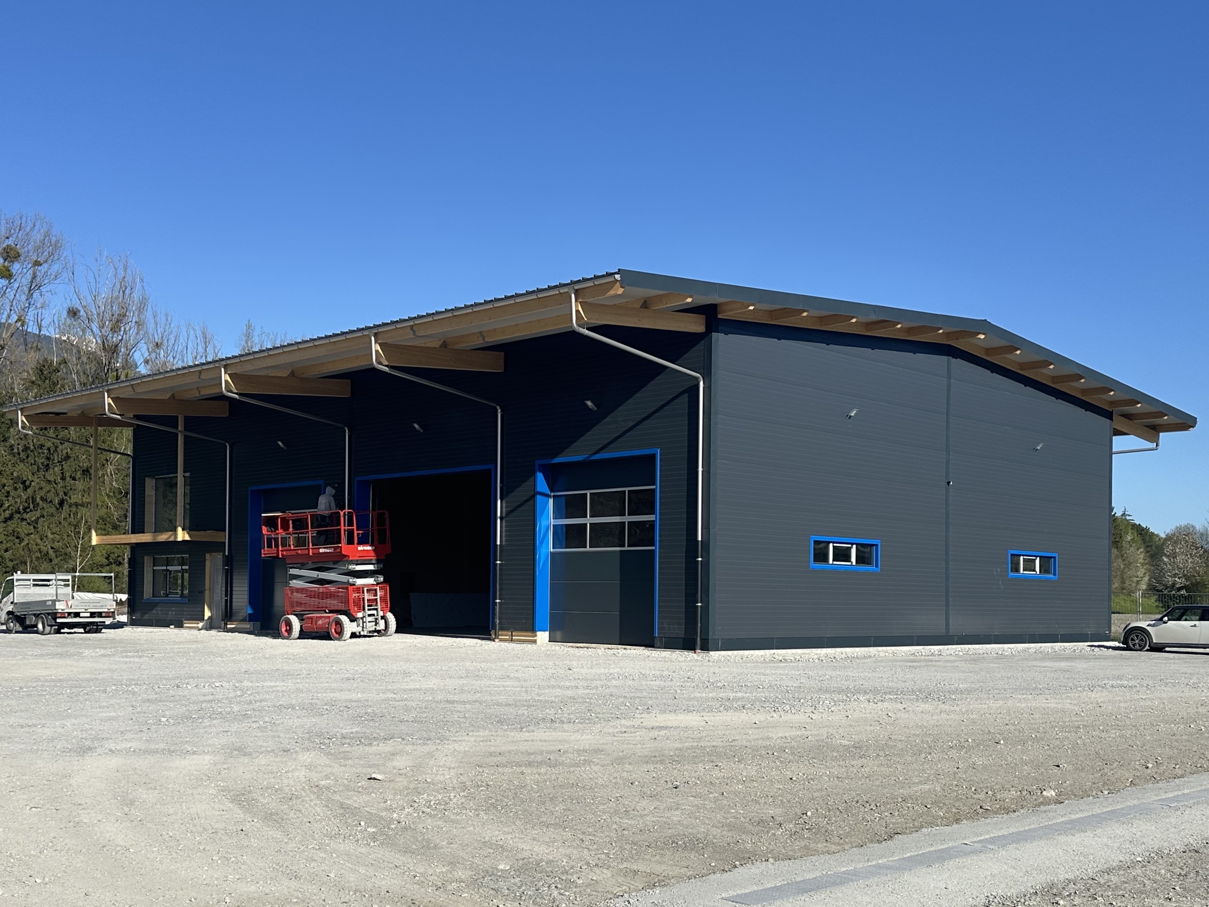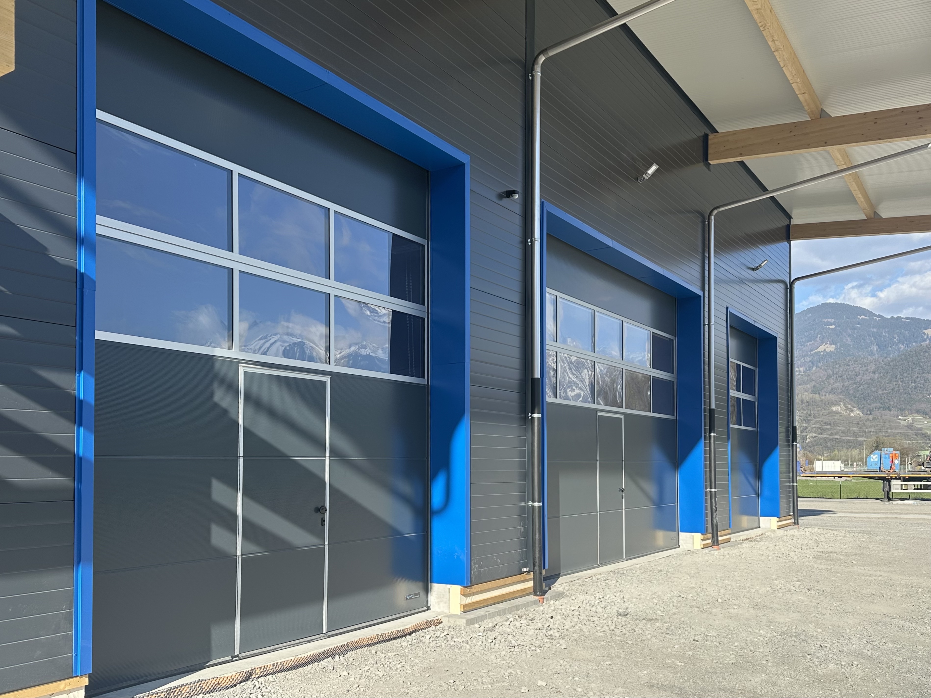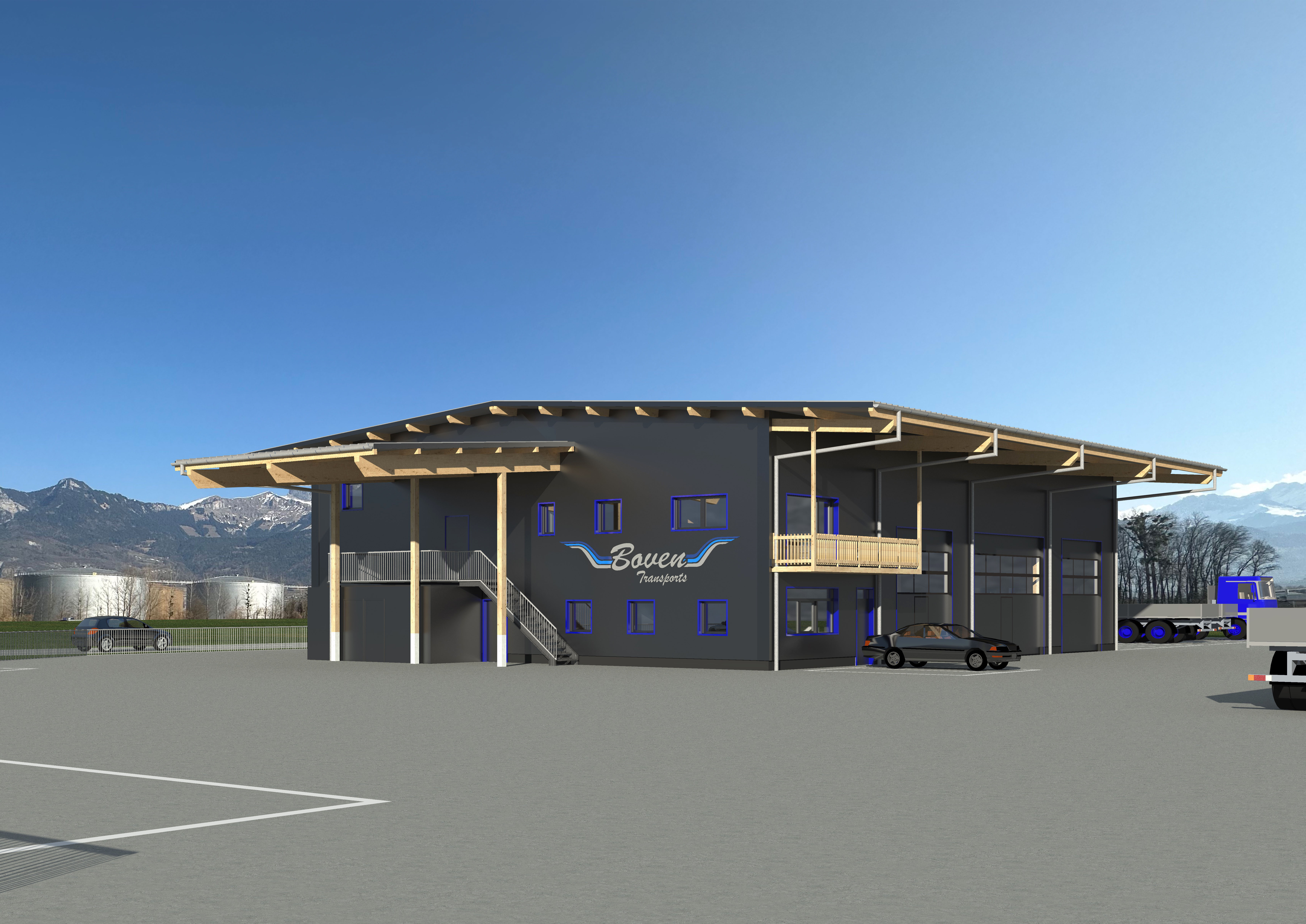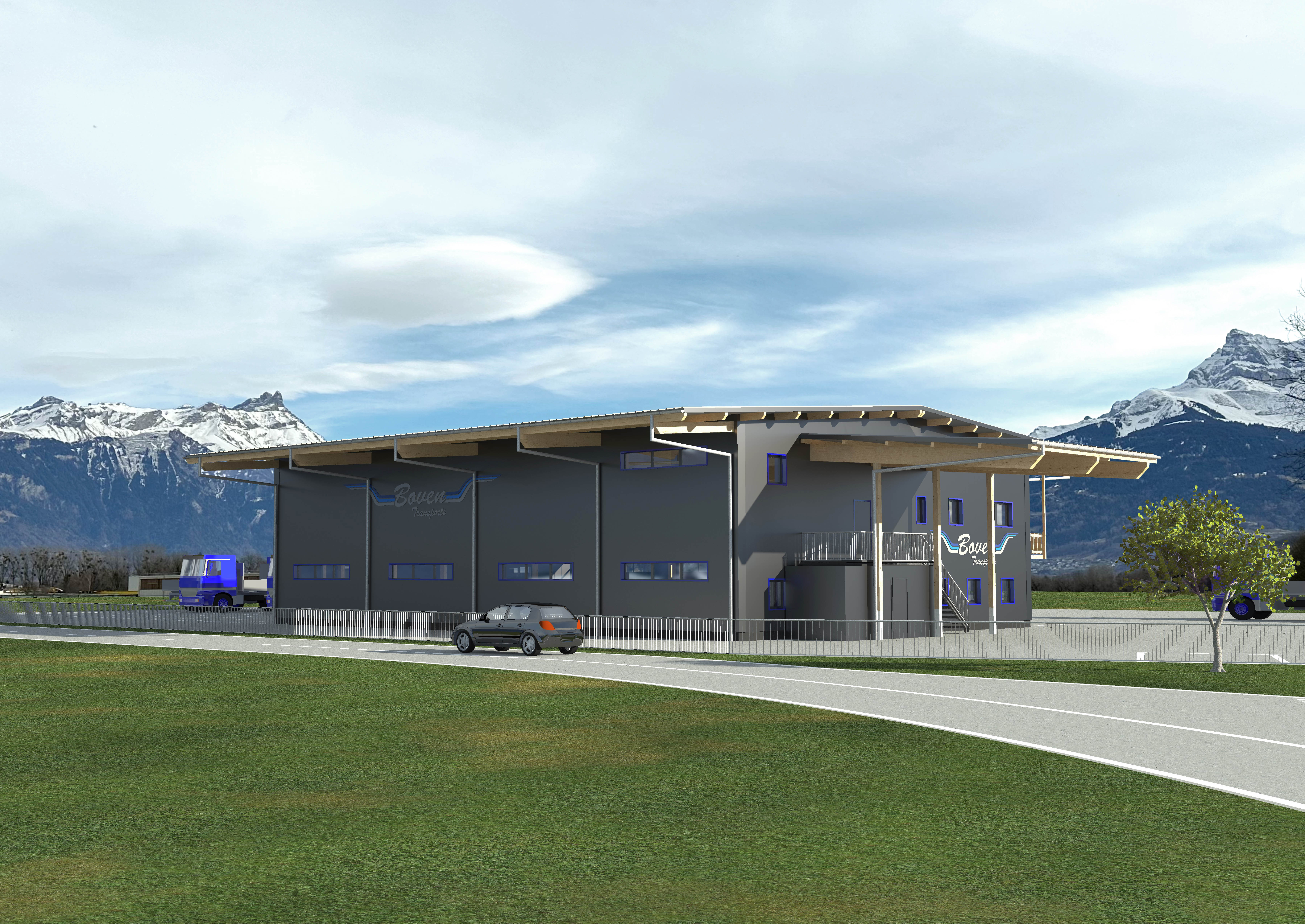 Sur la rive vaudoise du Rhône, dans la zone industrielle d’Aigle se trouve une bande de parcelles qui a récemment été définie comme zone à bâtir. C’est dans le virage à l’extrémité nord que l’entreprise Boven Transports a eu l’opportunité de réaliser son projet de halle. Le mandant possédant une collection de véhicules longs et parfois difficilement manœuvrables au vu de la nature des différents types de transport, cette situation avec un accès sur deux routes, au nord et à l’ouest, est un avantage certain.