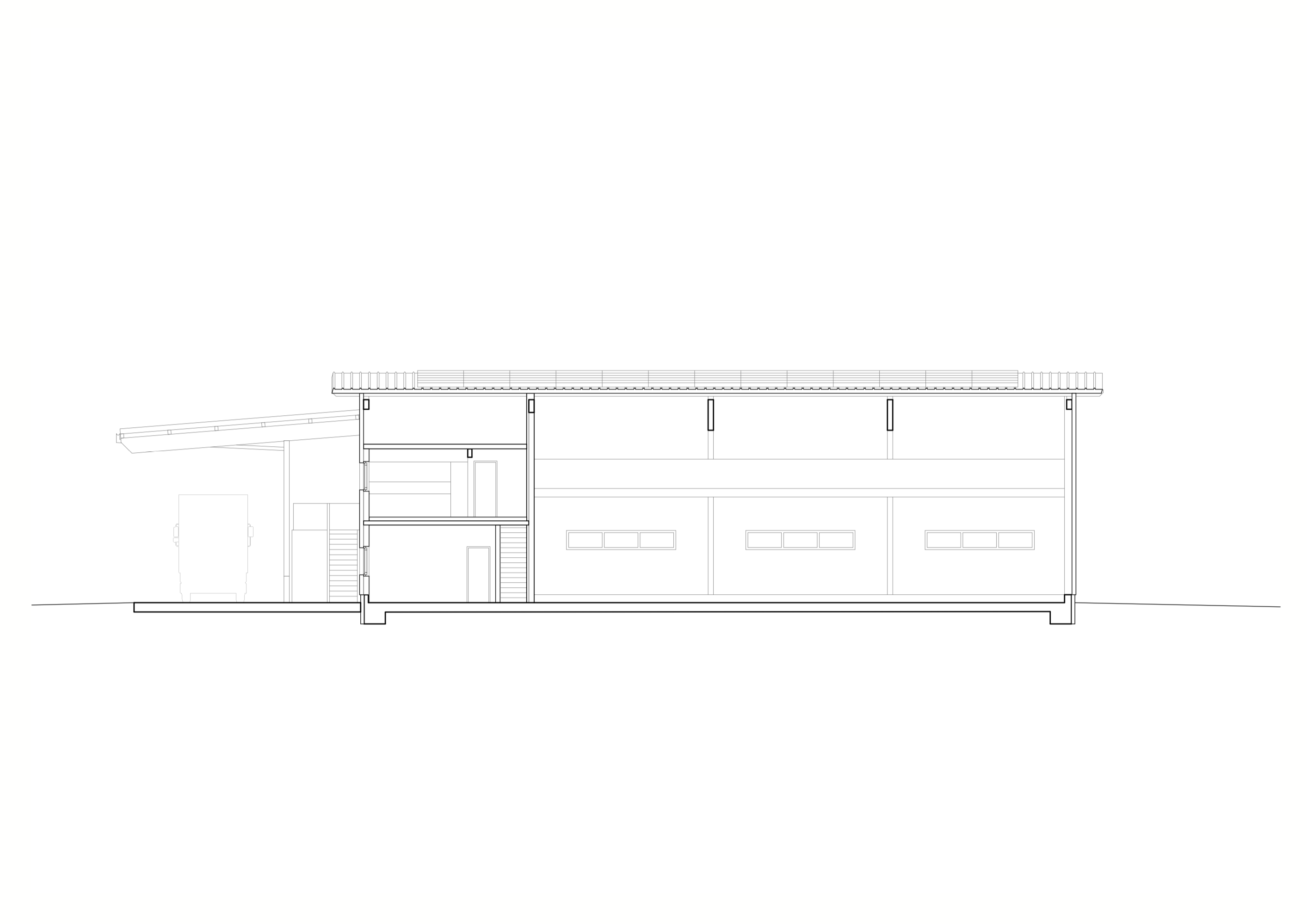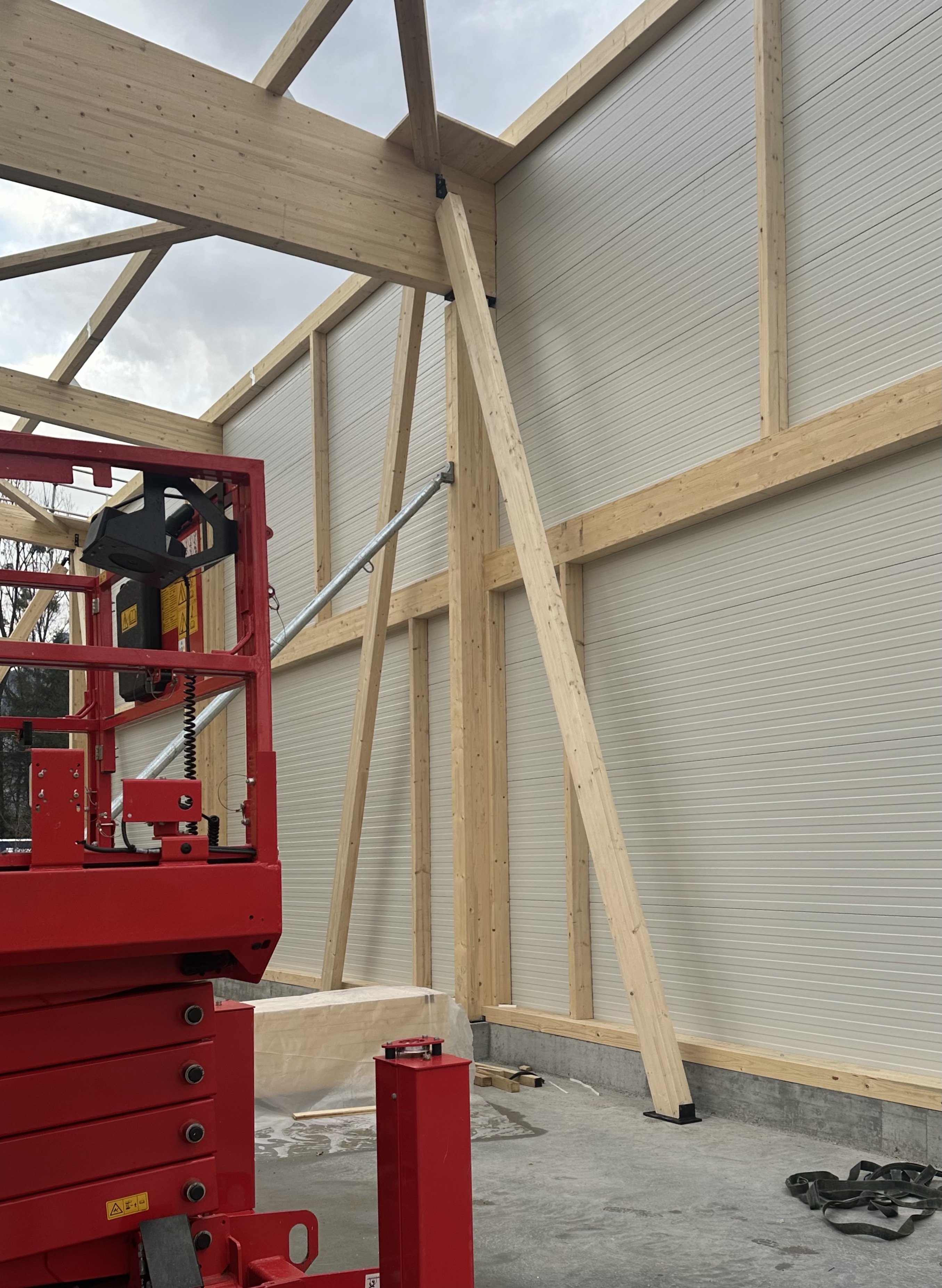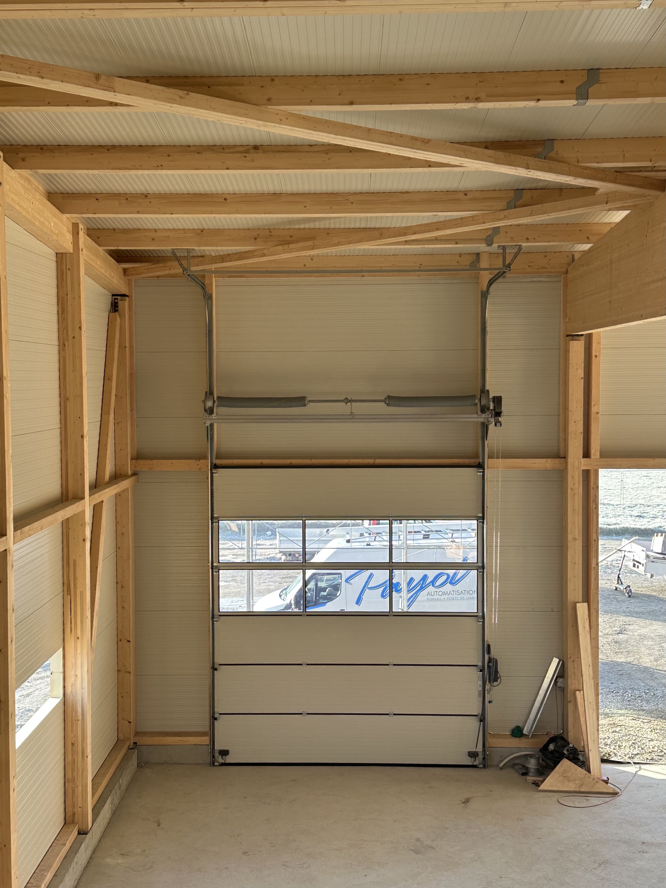 Dans le bâtiment se trouvent trois espaces distincts. La halle, vaste volume de hauteur importante, permet de garer des véhicules comprenant des équipements de tailles variables. Une mezzanine située au fond du bâtiment et longeant la plus longue façade offre une possibilité de stockage pour divers outils et matériels. Trois grandes portes sectionnelles permettent de faire entrer toutes sortes de véhicules. Au rez-de-chaussée, accessible par la façade sud, un sas d’entrée mène soit aux espaces du personnel administratif (bureaux, vestiaires, salle de repos), soit à l’étage, à un appartement de service. Ce dernier dispose d’une vue entièrement dégagée au sud sur les dents du Midi et à l’ouest sur la végétation luxuriante bordant le Rhône.