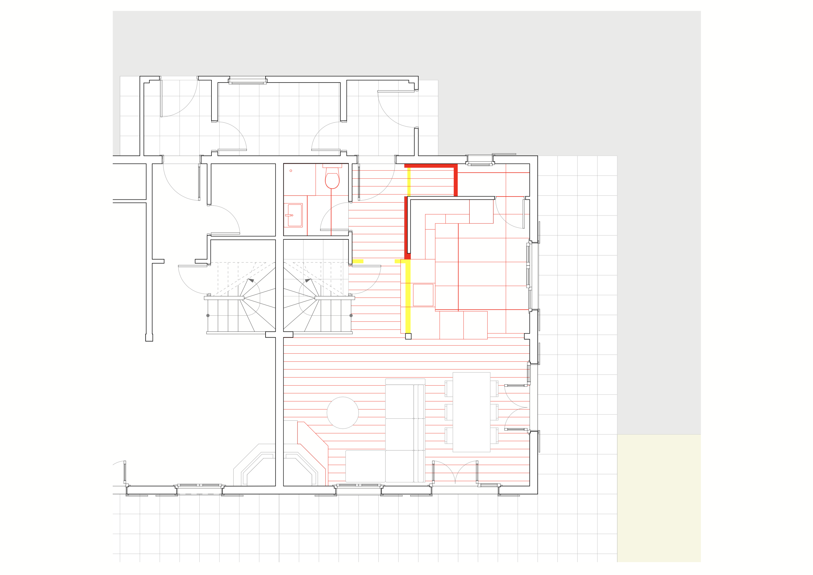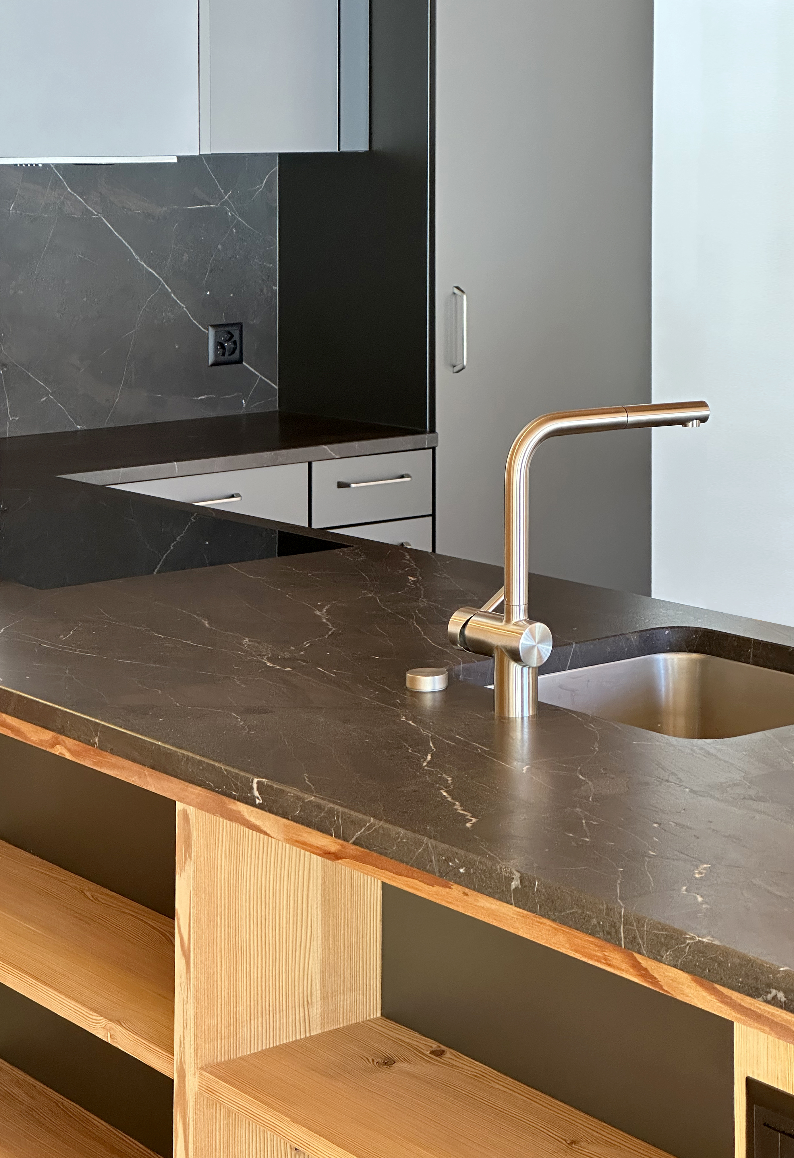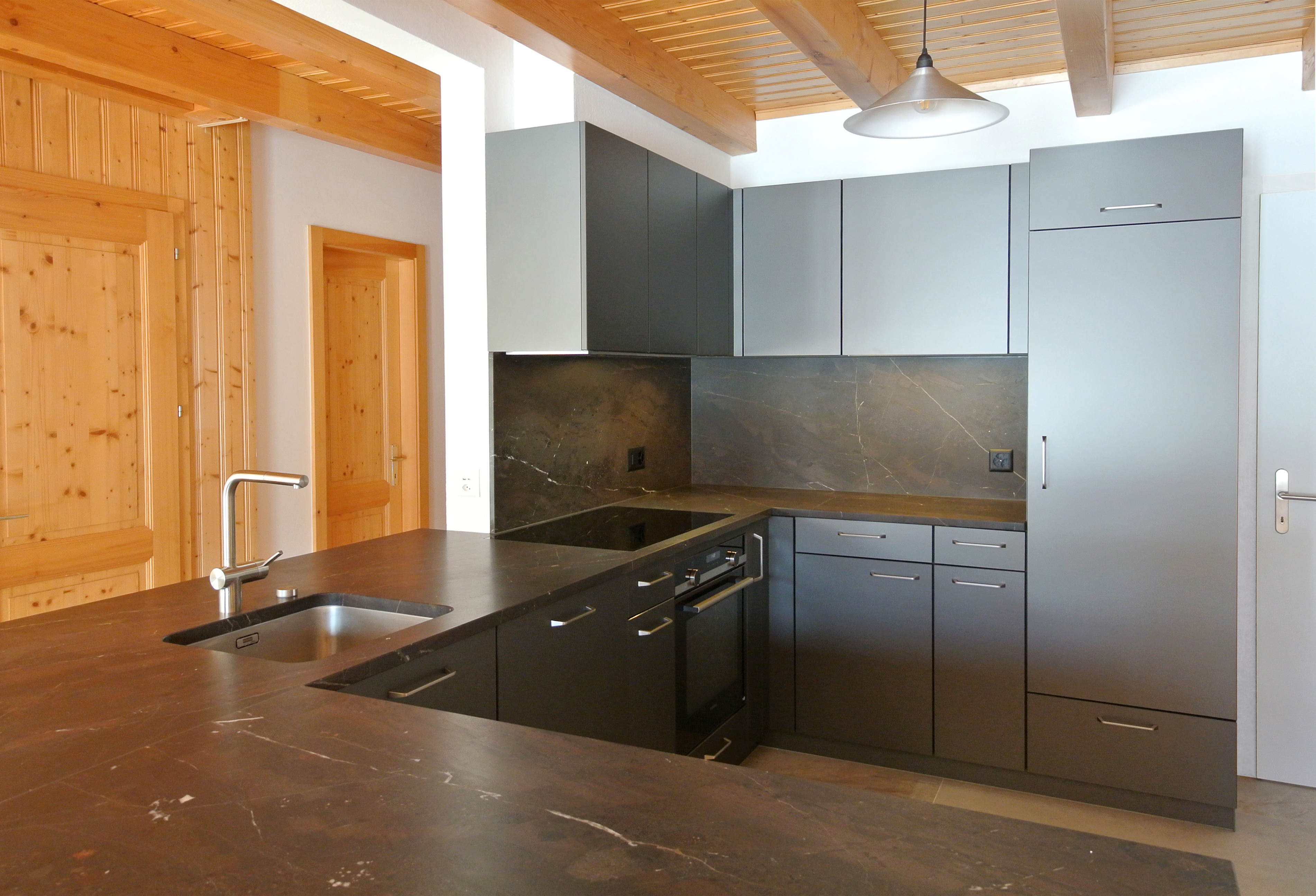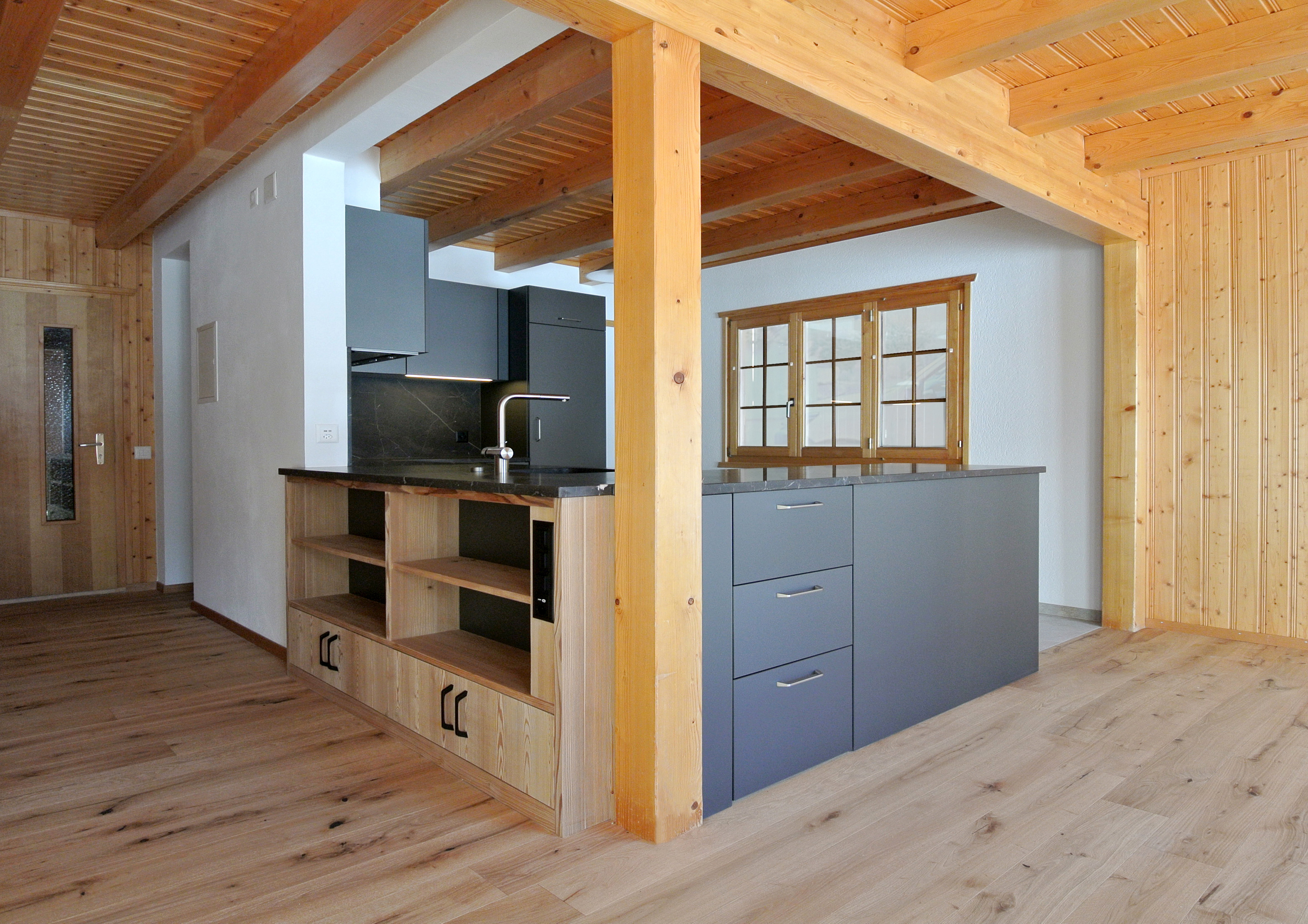 Le chalet est typique d’une construction rurale : bas de plafond pour garder la chaleur, il démontre une utilisation presque excessive des moulures à travers les menuiseries et les poutraisons. Il a fallu trouver une solution qui permette d’agrandir l’espace, qui fasse entrer la lumière et qui allège l’impression visuelle générale. Ainsi, plusieurs parois et séparations non porteuses sont tombées. La cuisine, entièrement remplacée, dispose exclusivement d’éléments bas en direction du hall et de la salle à manger, cela libère ainsi le regard et cet espace se retrouve alors mieux intégré aux espaces de vie. Le plan de travail du côté du hall est plus large afin de bénéficier de plus de place de travail. Cela a permis d’intégrer un meuble de rangement à l’arrière, conçu sur mesure pour bénéficier d’espace de rangement.