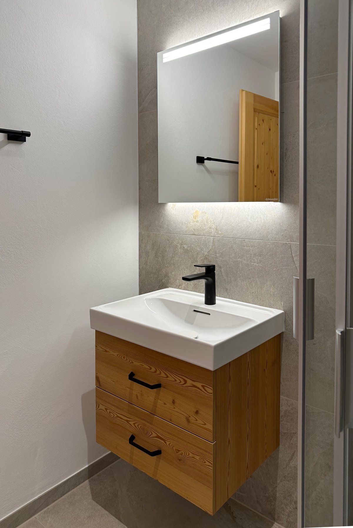 La salle de bain a également été entièrement rénovée. L’ajout d’un faux plafond a permis d’intégrer une lampe dans la pièce et de cacher les lames, les appareils sanitaires ont tous été remplacés. Le meuble du lavabo a été réalisé dans la même inspiration que le meuble du hall.